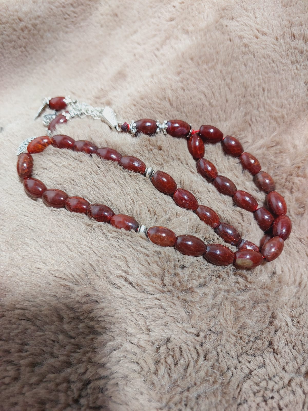 The tasbih features 33 perfectly rounded cherry agate beads, each one polished to a smooth finish that feels comfortable in your hands. The deep, rich hues of the cherry agate add a touch of sophistication, making it not only a tool for spiritual practice but also a beautiful accessory.